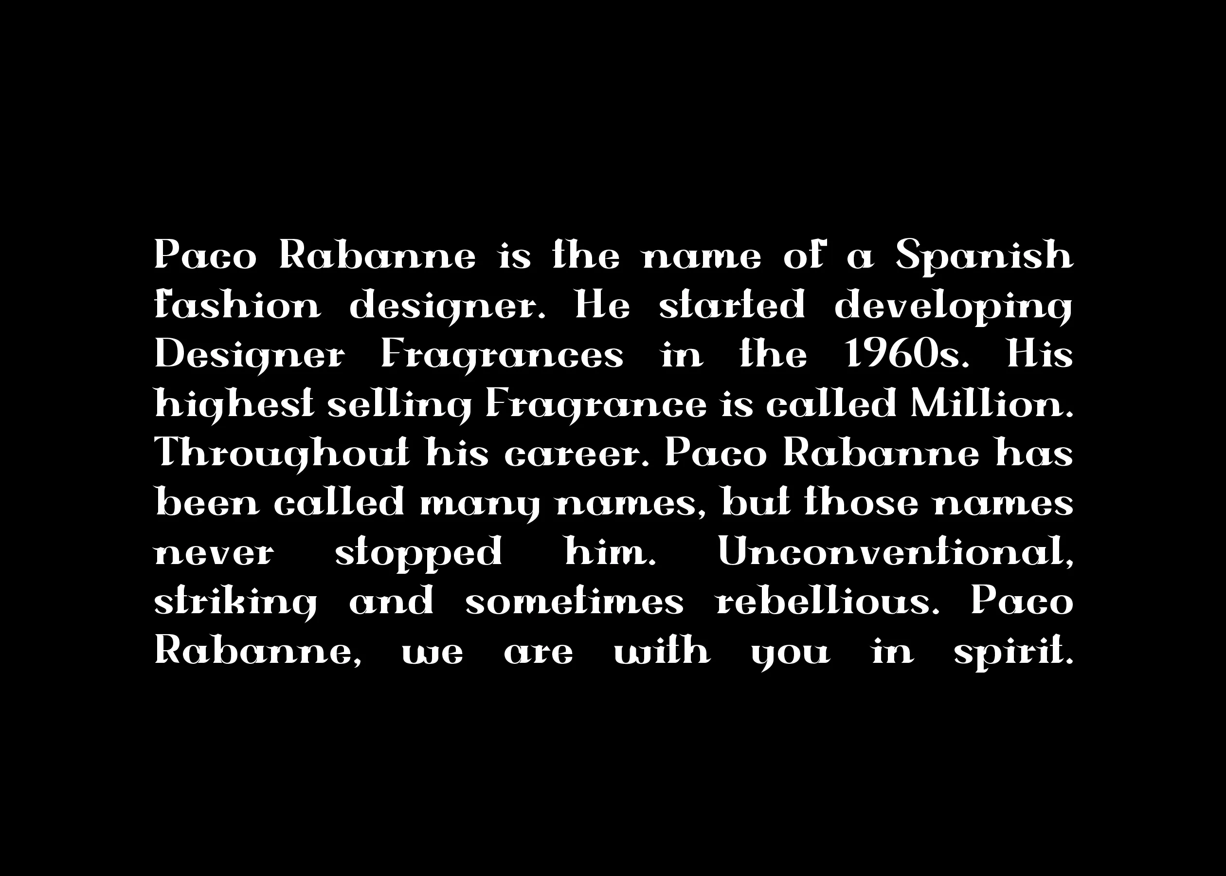 Rabanne is a serif inscriptional typeface developed and designed based on the spirt of Paco Rabanne. Paco Rabanne is a Spanish fashion designer who was known as an unruly child, l'enfant terrible of the 1960s French fashion world.